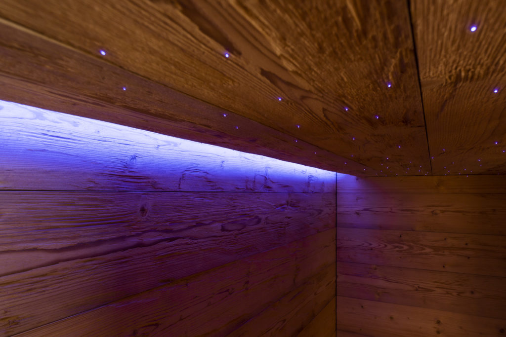 Die Decke mit Sternenhimmel lädt dazu ein, die Farben und Lichteinstellungen nach persönlicher Vorliebe zu variieren und mit der passenden Musik die Seele baumeln zu lassen. Der Raum ist vollständig mit Holz verkleidet, was nicht nur eine beruhigende Atmosphäre schafft, sondern auch durch seinen natürlichen Duft ein angenehmes Sinneserlebnis bietet.