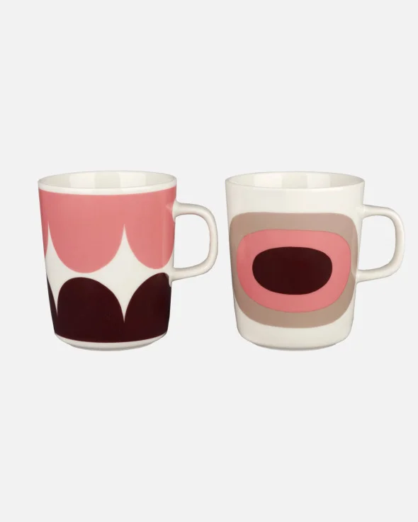 Die Oiva-Tassen von Marimekko bestehen aus weissem Steingut, das spülmaschinen-, ofen-, mikrowellen- und gefriergeeignet ist. Dieses Set enthält zwei Tassen, eine mit Härkä-Muster und eine mit Melooni-Muster.