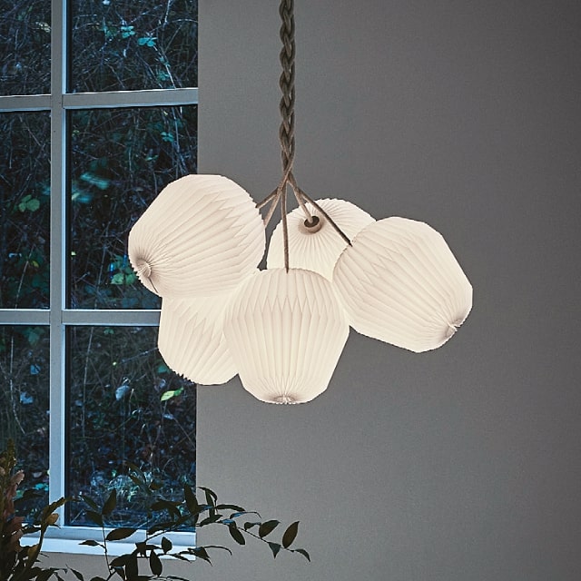 Ob über einem grossen Esstisch, im Treppenhaus oder als dekoratives Statement im Empfangsbereich – die Bouquet 130 5 ist ein echtes Lichtobjekt mit Charakter. Die Schirme sind wahlweise aus pflegeleichtem Kunststoff (Standard) oder aus Papier gefertigt und werden in Dänemark von Hand gefaltet.
