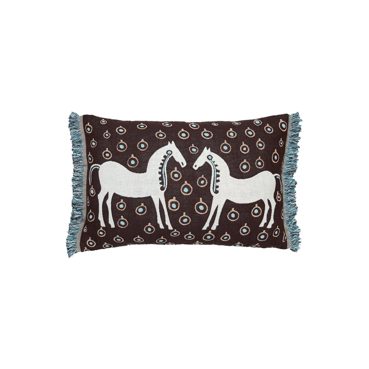 Der Musta Tamma Kissenbezug von Marimekko wird von eingewebten Pferde-Motiven und schönen Fransen geziert. Musta Tamma, auf Finnisch „schwarze Stute“, spiegelt die Erinnerungen der Künstlerin Maija Isolas an ihre Kindheit wider. Damals stellte sie sich oft vor, zusammen mit einer grossen Pferdeherde frei im Wald herumzugaloppieren.