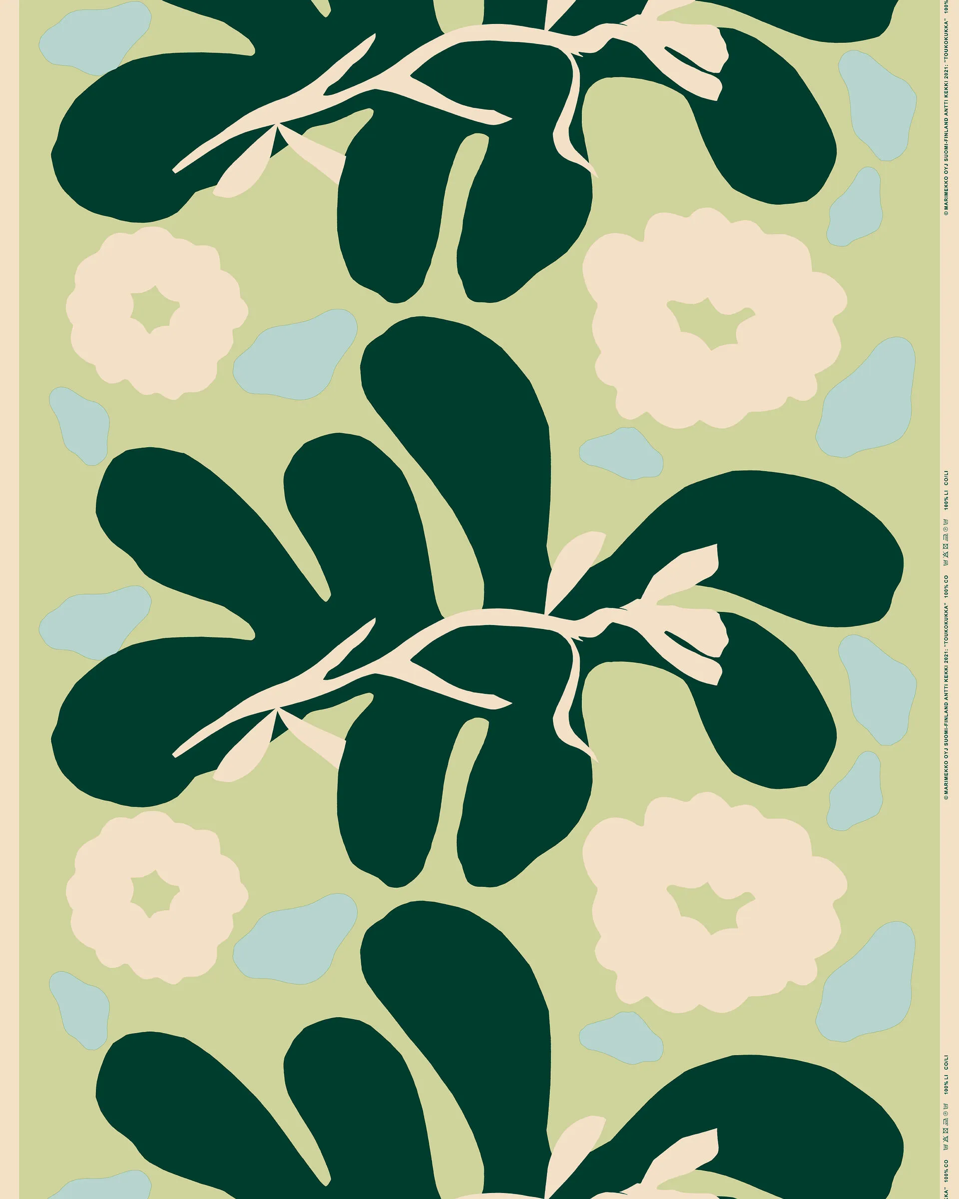 Design: Marimekko, Antti Kekki Material: 100% Baumwolle Rapportbreite: 140 cm Rapportlänge: 88 cm Farbe: grün, baumwolle, mint Preis pro m‘
