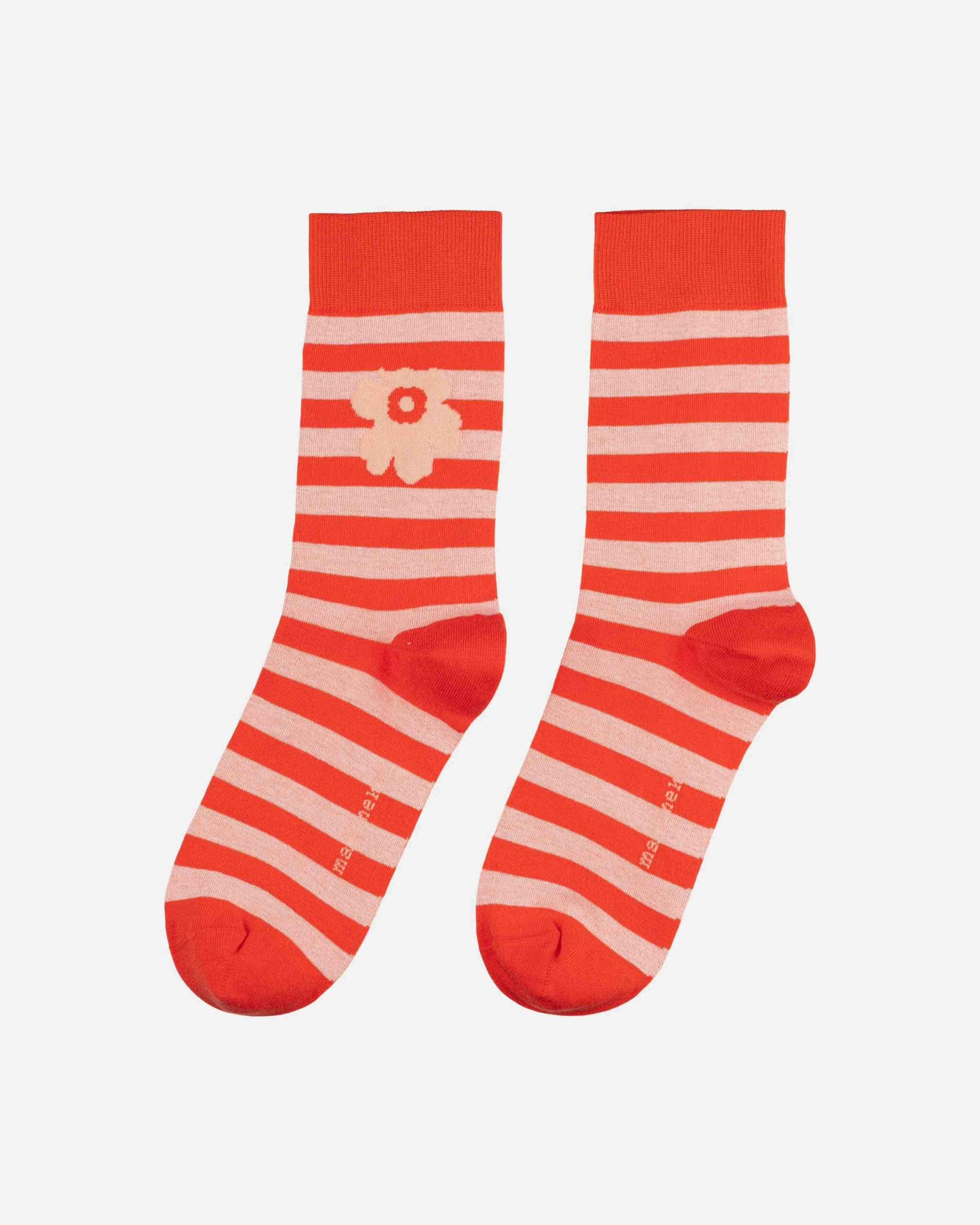 Die Kasvaa-Socken bestehen aus einer Baumwollmischung, sind gestreift und haben mit der Mohnblume das klassische Unikko-Muster aufgedruckt.