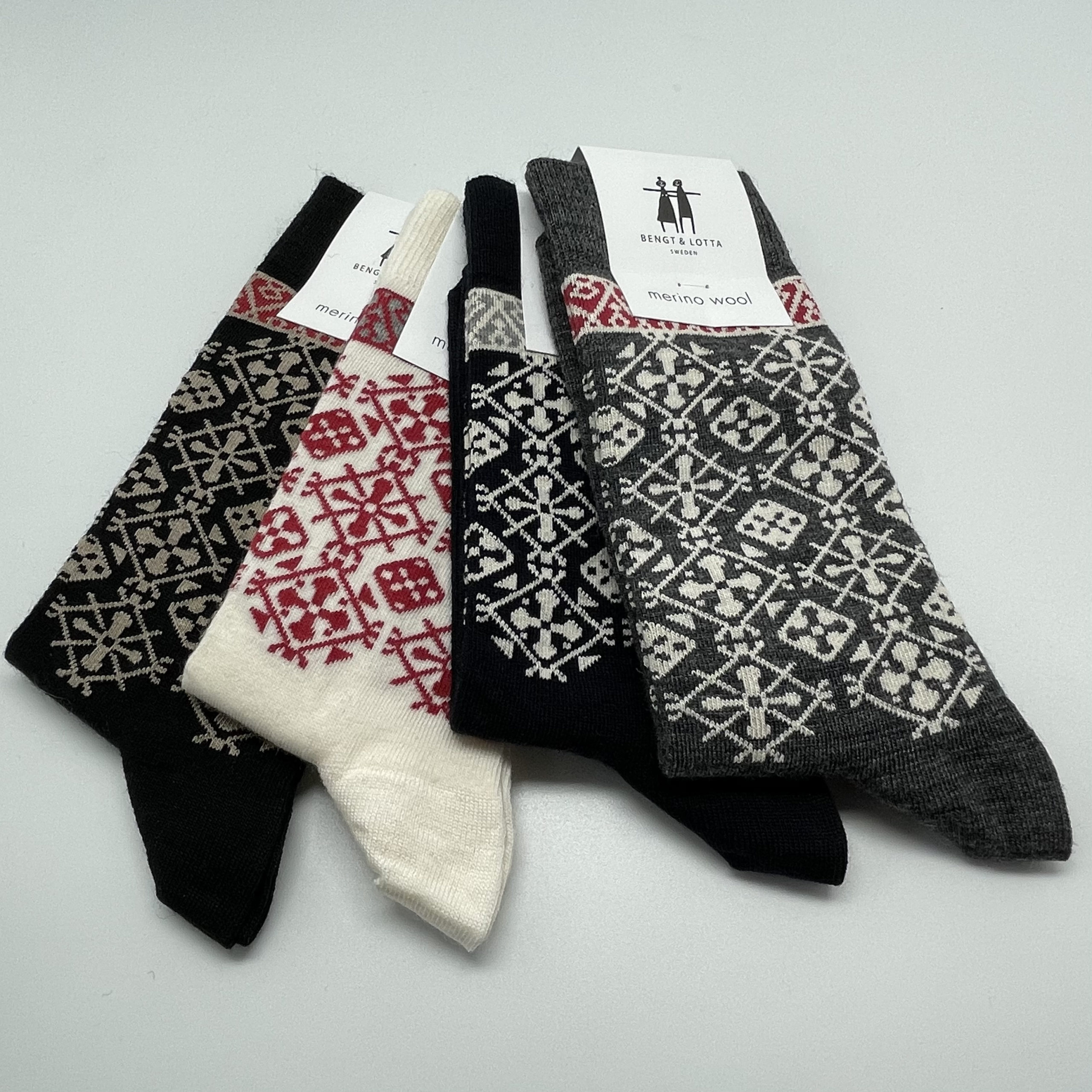 Die Socken vom Designerpaar Bengt & Lotta sind mit originellen Mustern gestaltet und werden von der traditionsreichen Weberei Cai in Südschweden mit viel Sorgfalt hergestellt. Die Merinowolle ist ein natürlicher Wärmeregulator und dadurch sehr beliebt. So können die Socken sowohl im Sommer wie auch im Winter getragen werden. Zudem werden diese auch wegen ihrer guten Strapazierfähigkeit und Langlebigkeit geschätzt. Ein praktisches Geschenk für jung und alt.